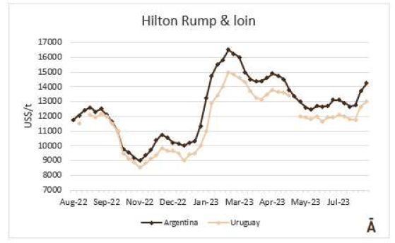 上周,希爾頓配額范圍內(nèi)的冰鮮市場(chǎng)再次走強(qiáng),阿根廷的臀腰肉價(jià)格在FOB 14000-14500美元之間。一位歐洲貿(mào)易商評(píng)論道:“目前,歐洲沒有足夠的產(chǎn)品,這也有助于價(jià)格上漲。此外,市場(chǎng)上的肉類數(shù)量有限,因此需求狀況良好?!?span>