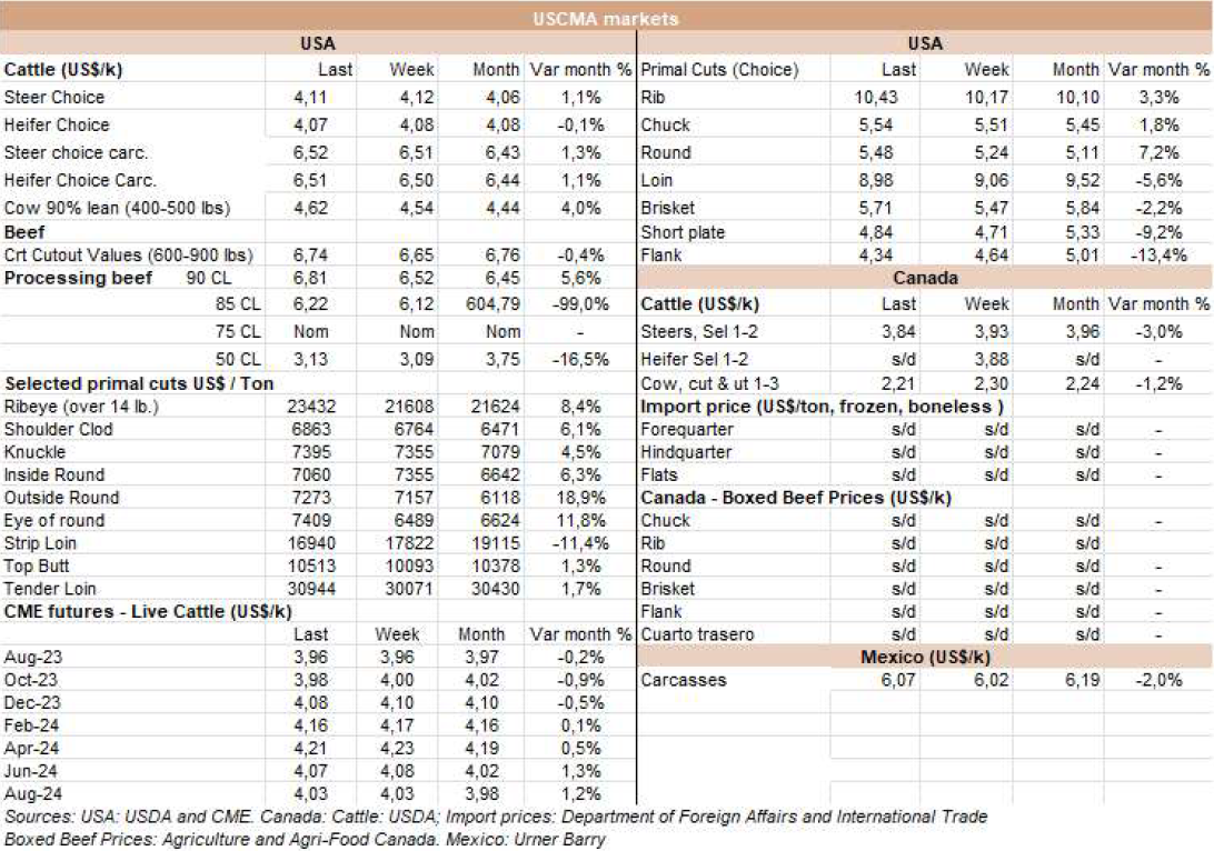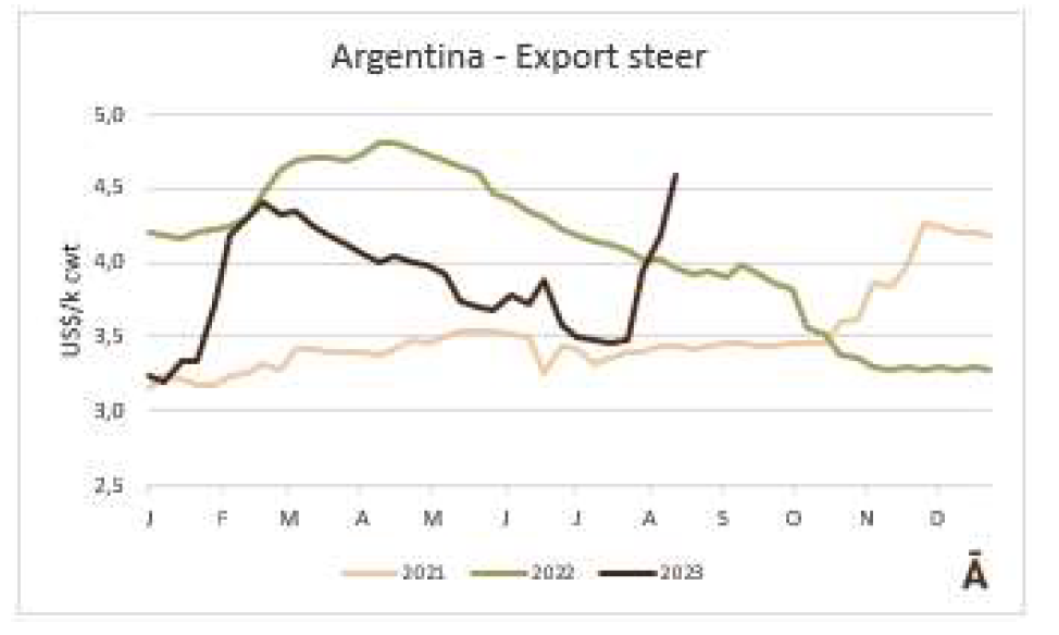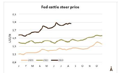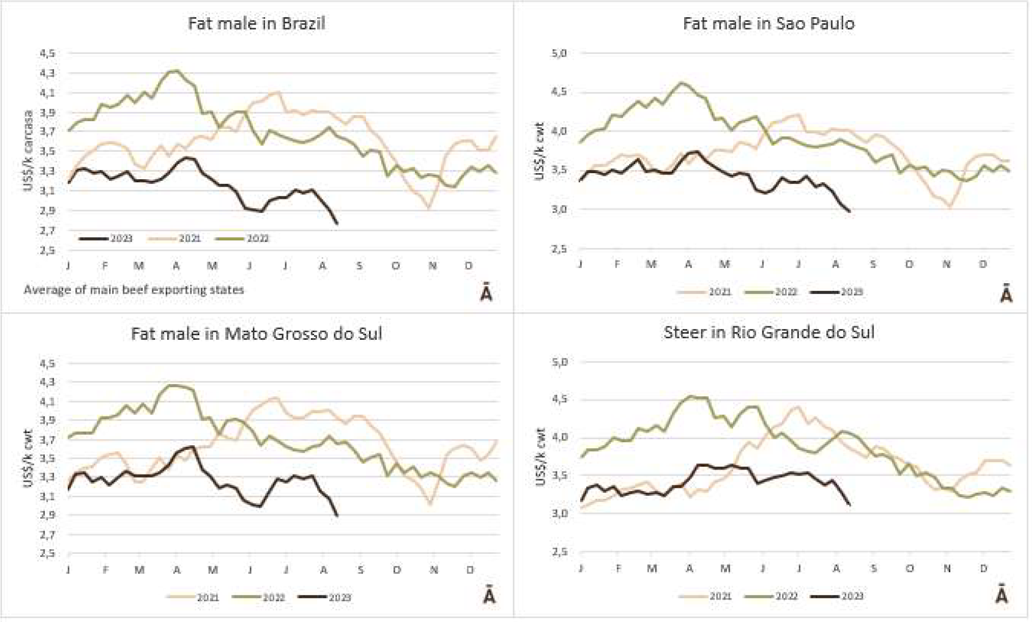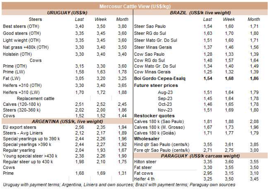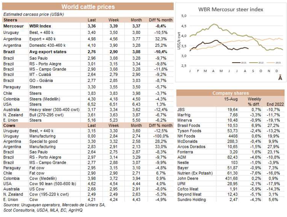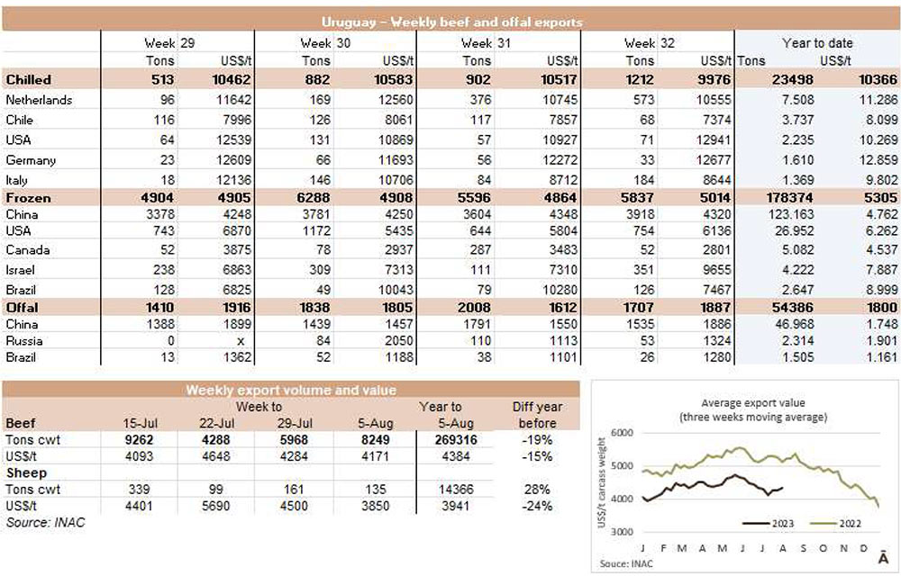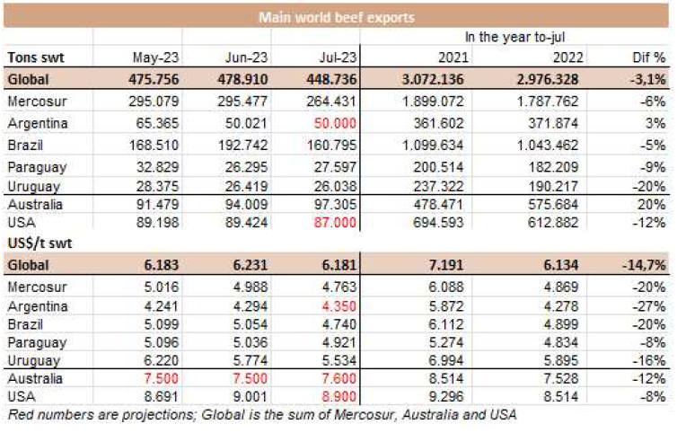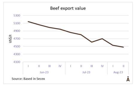 根據(jù)外貿(mào)部的數(shù)據(jù),8月第二周,巴西以每噸4482的平均價(jià)格出口了42077噸牛肉。平均價(jià)格為4500美元/噸,比6月第一周的平均價(jià)格每噸低600美元(-13%)。在8月的前9個(gè)工作日,巴西以每噸4507的平均價(jià)格出口了83344噸牛肉。預(yù)計(jì)月底的產(chǎn)量將略低于20萬噸,這意味著與2022年8月的20.3萬噸相比將略有下降。