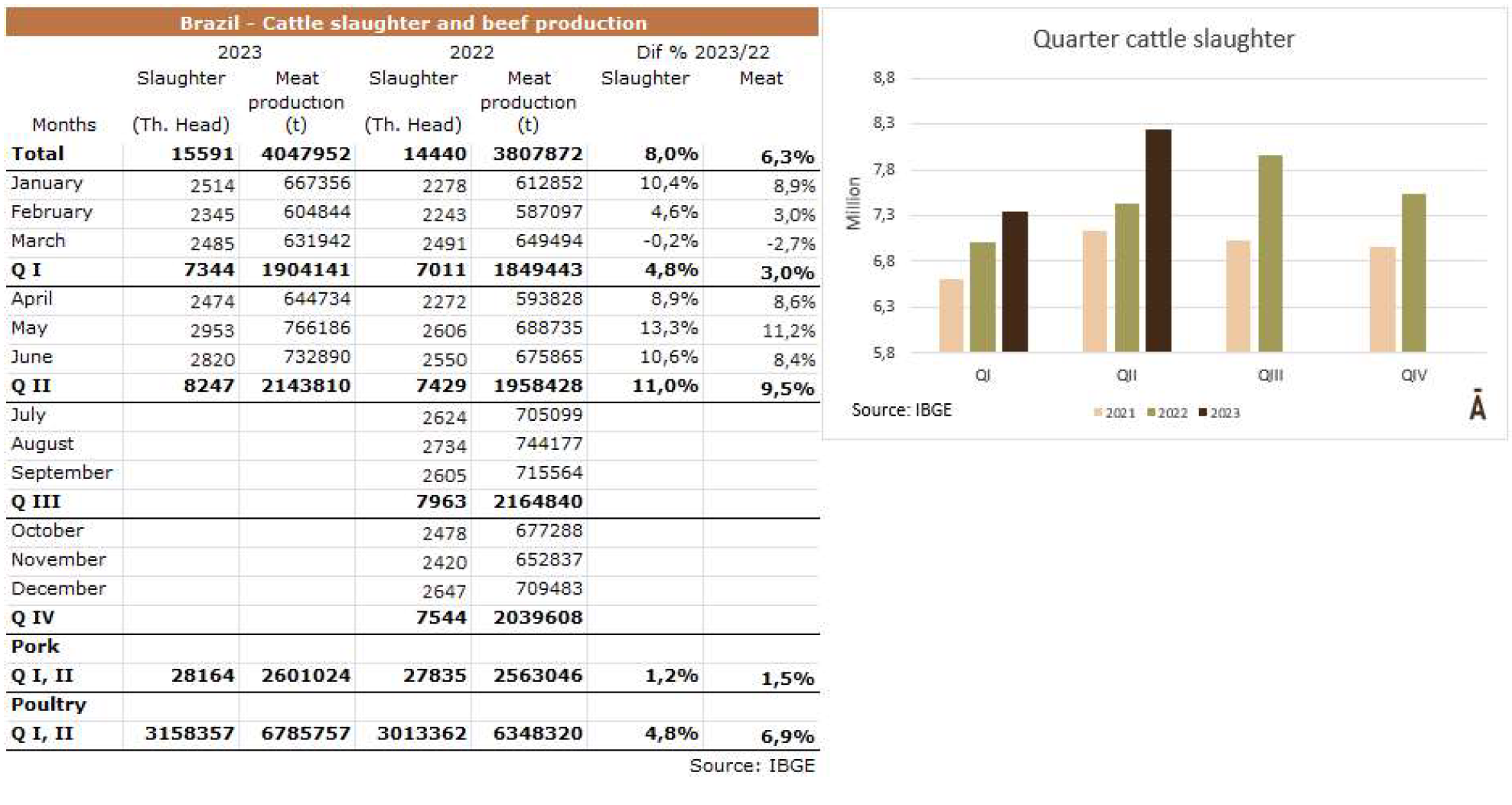 根據(jù)IBGE發(fā)布的畜牧業(yè)生產(chǎn)統(tǒng)計(jì)的初步結(jié)果,2023年第二季度,巴西有825萬頭牛在某種類型的衛(wèi)生檢查下被屠宰。與2022年第二季度相比,這一數(shù)量增長(zhǎng)了11%,與2023年第一季度相比增長(zhǎng)了12.3%;與前三個(gè)月相比,增加了90.3萬頭。2023年第二季度214萬噸牛肉胴體的產(chǎn)量,意味著與上年同期相比增長(zhǎng)9.5%,與2023年第一季度相比增長(zhǎng)12.6%。由于屠宰量的增加是由于被送往屠宰場(chǎng)的雌性數(shù)量增加,因此酮體的重量往往會(huì)減少。該季度平均體重為260公斤,比2022年同期減少3.7公斤。與此同時(shí),豬肉產(chǎn)量總計(jì)130萬噸,同比下降0.3%,而家禽產(chǎn)量增加330萬噸,同比增長(zhǎng)7.2%。