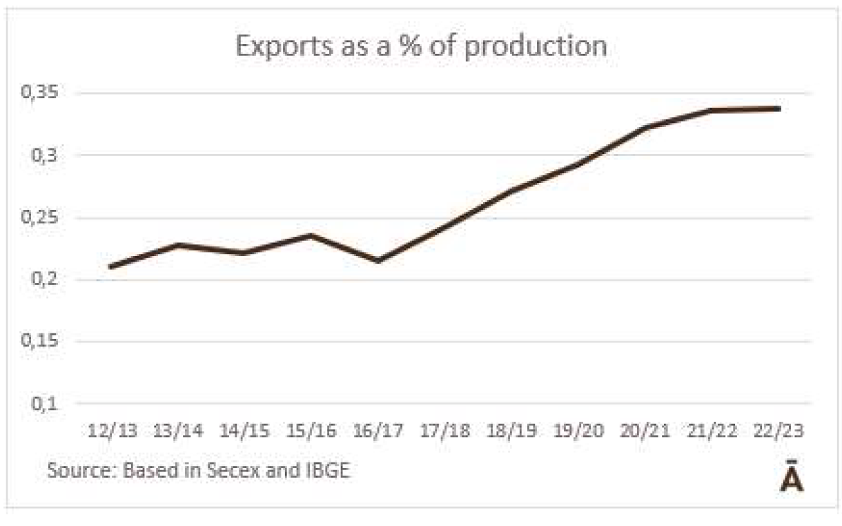 2022/23年,巴西生產(chǎn)了825萬噸牛肉胴體,與上一財(cái)年相比增長(zhǎng)了8%(60.7萬噸)。反過來,牛肉出口總量為278萬噸胴體,按百分比計(jì)算,增幅略高于產(chǎn)量(21.6萬噸)。因此,巴西國(guó)內(nèi)牛肉消費(fèi)量也增長(zhǎng)了8%,估計(jì)為547萬噸,比2021/22年增加了39.1萬噸。巴西停止了2016/17年開始的牛肉出口比例增長(zhǎng)趨勢(shì)。在7月1日開始的2023/24財(cái)政年度,考慮到國(guó)際需求的疲軟和屠宰牛價(jià)格的下降,出口牛肉的比例將有所下降,這對(duì)巴西人來說是可行的。在7月1日開始的2023/24財(cái)政年度,考慮到國(guó)際需求的疲軟和屠宰牛價(jià)格的下降,出口牛肉的比例將有所下降。