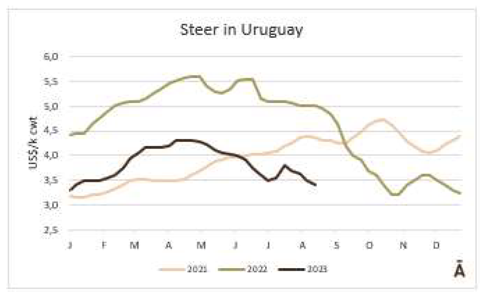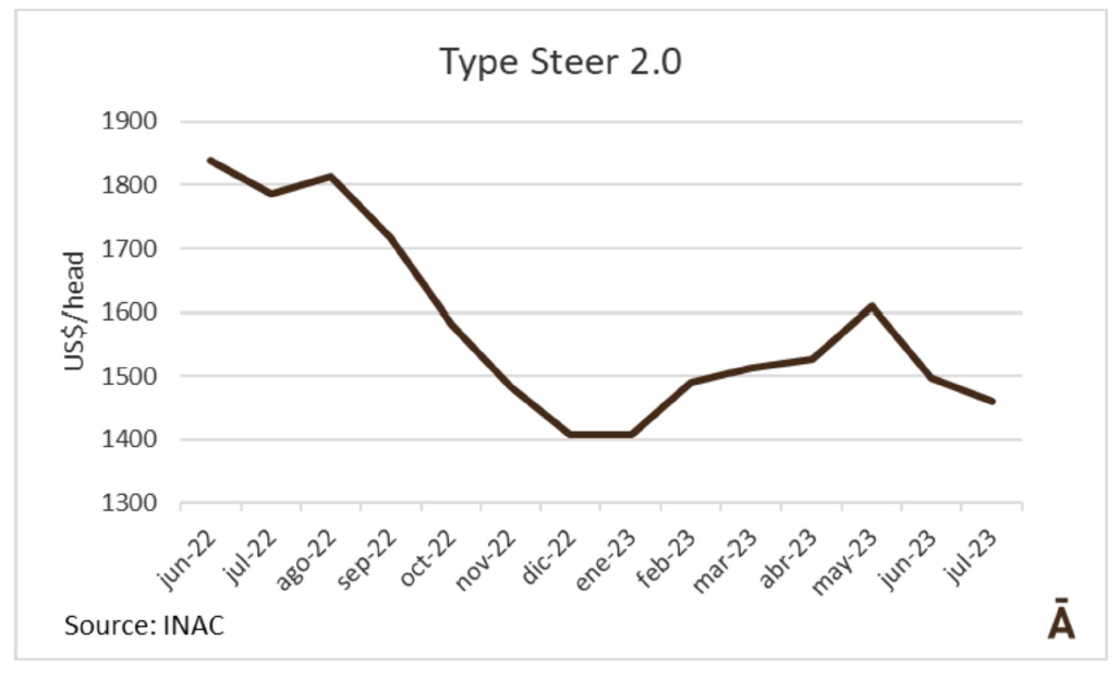 INAC 閹牛類型價(jià)值2.0在6月份跌了100美元以上后,7月份每頭又下跌36美元至1461美元。INAC閹牛類型價(jià)值預(yù)計(jì)了銷售烏拉圭特質(zhì)公牛所有產(chǎn)品中獲得的收入,并按比例考慮了在國(guó)外和當(dāng)?shù)厥袌?chǎng)的布局。由于出口和國(guó)內(nèi)市場(chǎng)胴體價(jià)格下跌導(dǎo)致閹牛類型價(jià)值下降。另一方面,內(nèi)臟和副產(chǎn)品的價(jià)值以及生皮的價(jià)格也保持穩(wěn)定。7月份,公牛的價(jià)格下降了5.1%(61美元)至1133美元/頭。另一方面,工業(yè)增加值在月度比較中每頭回升25美元(+8.3%)。