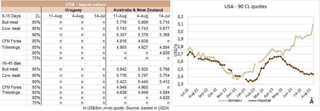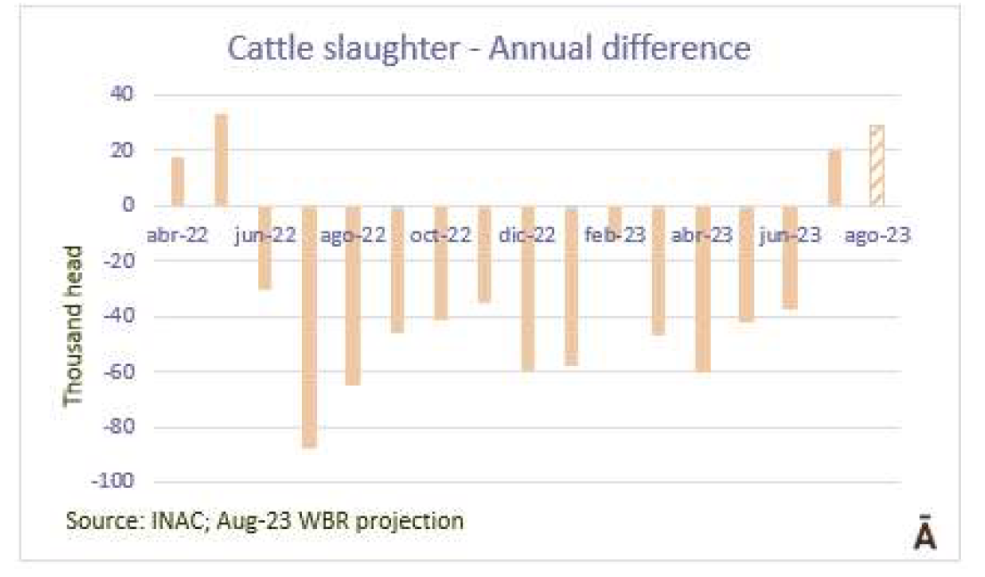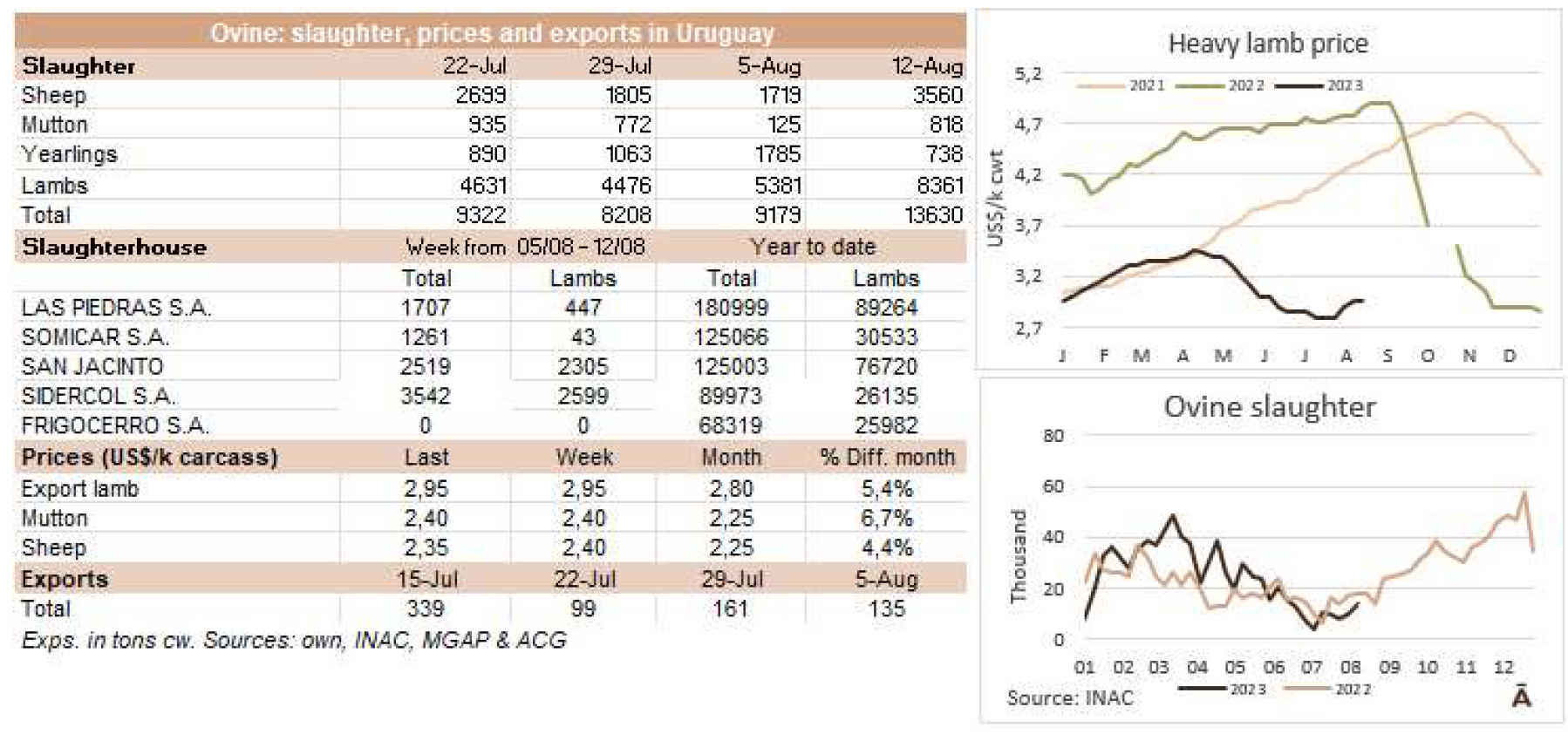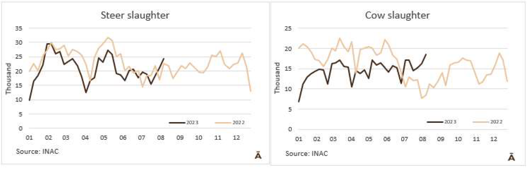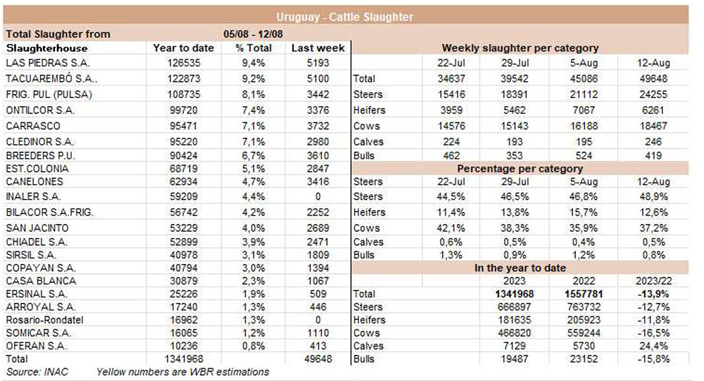 上周的牛屠宰量接近5萬頭,是自5月第二周以來數(shù)量最多的一周,當(dāng)時(shí)屠宰場(chǎng)也在積極為481配額窗口工作。INAC報(bào)告稱,在截至8月12日的一周內(nèi),有49648頭牛進(jìn)入工廠,比前一周增加了10%,比去年同期的37000頭增加了33%。屠宰量最大是Las Piedras(5193)、Marfrig-Tacuaremb6(5100)和Minerva Carrasco(3732)。擁有三個(gè)工廠的Marfrig屠宰了10927頭牛(周比較為-255頭),而同樣擁有三個(gè)工廠的Minerva屠宰了10590頭牛(周增加3552頭)。Marfrig lnaler本周再次開始恢復(fù)生產(chǎn),而Cledinor下周將進(jìn)入許可期。就Minerva而言,從下周開始,它將進(jìn)入卡拉斯科工廠的許可期。截至8月,共有86907頭牛被屠宰,比去年同期多36%。事實(shí)上,牛的屠宰量將連續(xù)第二個(gè)月高于2022年。