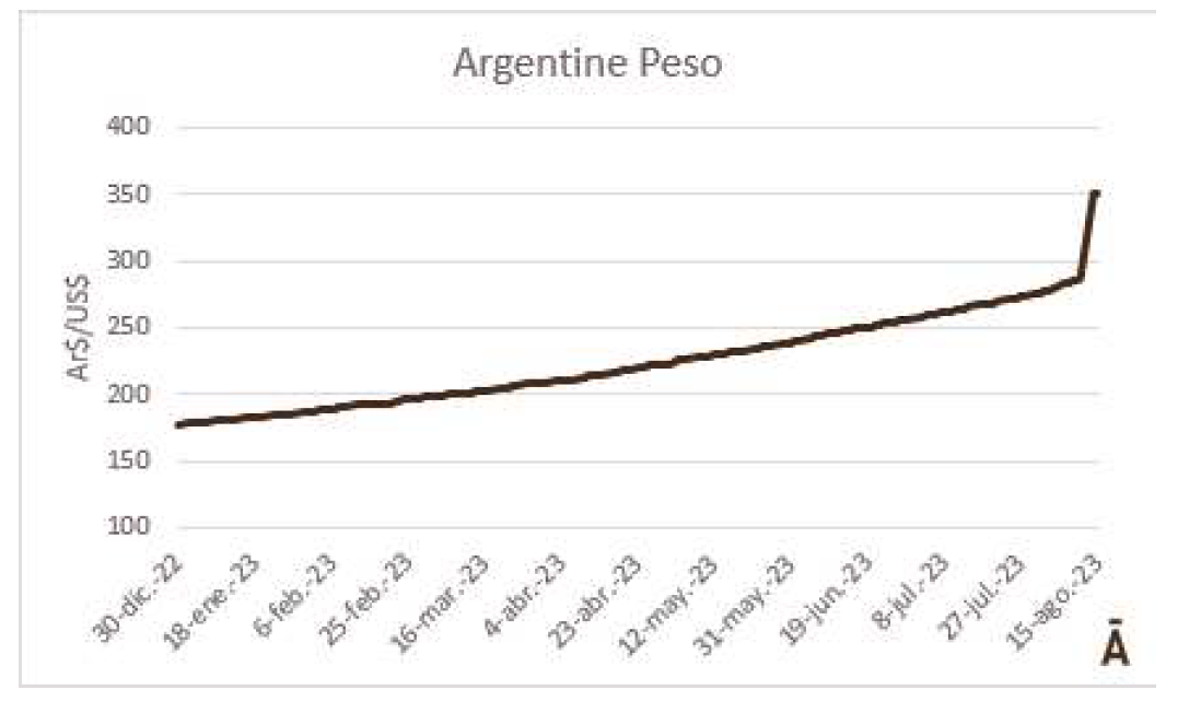 周日的選舉結(jié)果顯示,得票最多的候選人是哈維爾·米利,他是一位經(jīng)濟(jì)學(xué)家,在2021年之 前沒有政治生涯,提出了極端自由主義的建議。周日,被稱為“加密貨幣”的金融美元上漲了約10%。周一,根據(jù)國(guó)際貨幣基金組織發(fā)放資金的要求,政府將阿根廷比索貶值22%,以縮小其與自由美元之間超過100%的匯率差距。然而,隨著非官方匯率升至700比索以上,這一差距立即再次擴(kuò)大。所有這些不確定性,在一個(gè)更加微妙的情況下,導(dǎo)致所有行業(yè)的銷售額普遍下降。昨天,政府與超市和食品公司召開緊急會(huì)議,試圖阻止價(jià)格上漲。