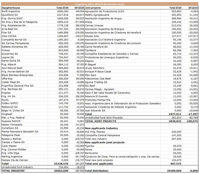 巴西公司Swift(Minerva)、Quickfood(Marfrig)和阿根廷Gorina、Imp.Y Exp.De la Patagonia(Supermercados la Anonima)和Frigorifico Rioplatense是希爾頓2023/24年配額的五大主要贏家,累計(jì)10308噸,占總數(shù)的35%。除La Anonima外,其他四家在2022/23財(cái)政年度增加了希爾頓配額范圍內(nèi)的參與度。