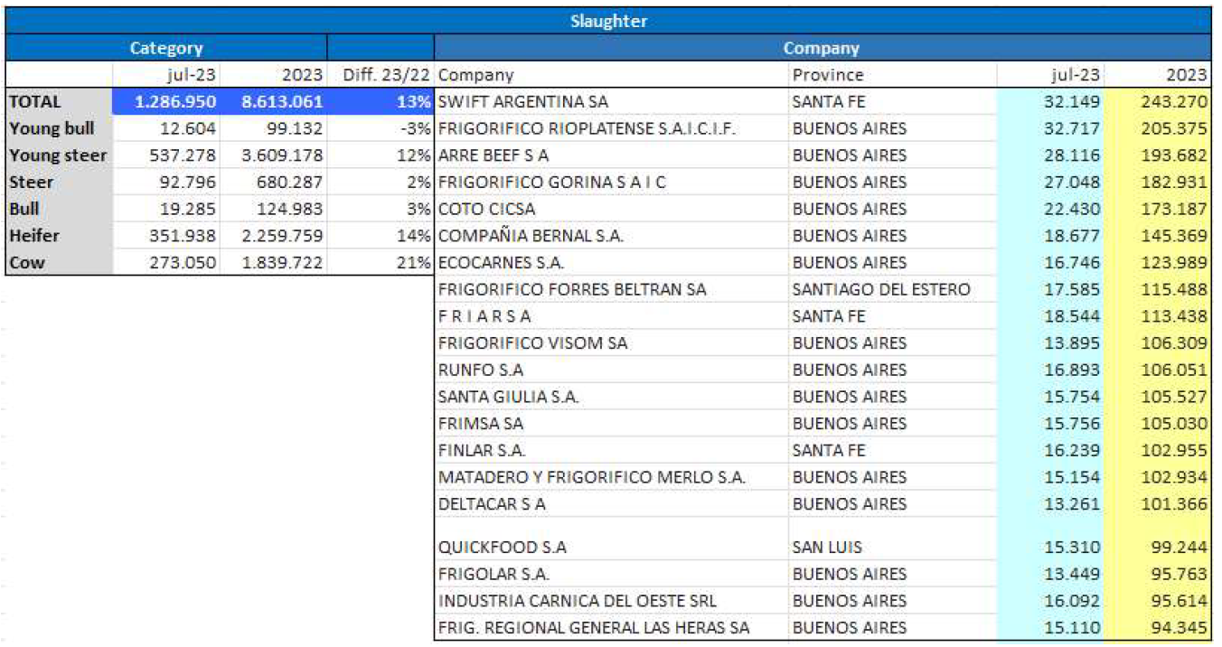 7月份,共屠宰129萬頭牛,比上月減少2%,比去年同月增加16%.根據(jù)官方數(shù)據(jù)。在今年的前7個(gè)月,861萬頭牛被屠宰,年增長(zhǎng)率為13%,這是自2009年大清算以來的最大增幅,該清算使該國(guó)的牛存欄減少了20%。與2022年相比,2023年的增長(zhǎng)尤其體現(xiàn)在屠宰量增長(zhǎng)了21%,然后是小母牛增長(zhǎng)了14%,其次是幼牛,年增長(zhǎng)了12%。7月份,母牛屠宰量占總數(shù)的48.5%以上。今年到目前為止,這一比例約為47.5%,而2022年同期為46%。
