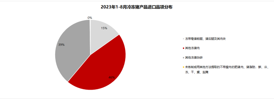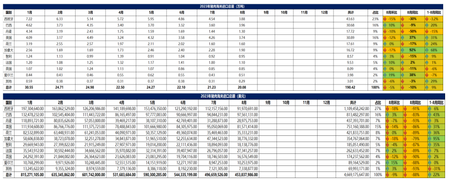 2023 年 8 月中國主港豬肉進口量 20.08 萬噸,環(huán)比減少 5%,同比減少 10%。1-8 月主 港豬肉進口量 190.42 萬噸,同比增加 9%。從進口國別看,其中,從西班牙進口豬肉共計 43.63 萬噸,同比減少 3.2%,占比 23%。從美國進口豬肉共計 30.89 萬噸,同比增加 31%,占比 16%。從巴西進口豬肉共計 30.68 萬噸,同比增加 20%,占比 16%。從丹麥進口豬肉共計 17.72 萬噸,同比減少 15%。值得關注的是,8 月巴西豬肉進口量 3.96 萬噸,環(huán)比增加 10%, 同比減少 9%,首月超過從西班牙進口豬肉數(shù)量(3.88 萬噸),排名第一。從進口品項看,1-8 月,凍帶骨豬前腿、豬后腿及其肉塊進口量 28.81 萬噸,占比 15%。其他凍豬肉進口量 87.51 萬噸,占比 46%。其他凍豬雜碎 73.70 萬噸,占比 39%。豬油脂類進口量僅 0.37 萬噸。從 進口金額看,1-8 月,主港豬肉進口總額 46.69 億美金,同比上漲 22%。其中,進口西班牙 豬肉金額 11.09 億美金,同比上漲 6%。進口巴西豬肉金額 8.13 億美金,同比上漲 43%。進 口美國豬肉金額 7.51 億美金,同比上漲 31%。進口丹麥豬肉金額 4.37 億美金,同比上漲 3%。