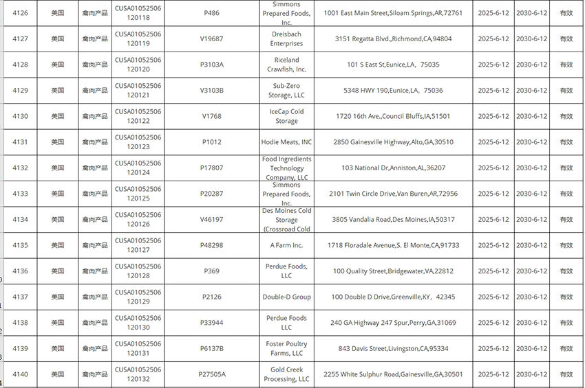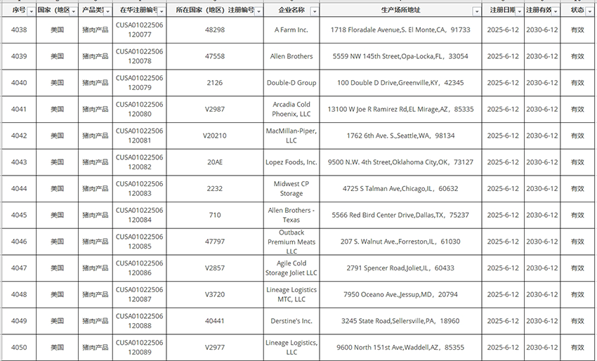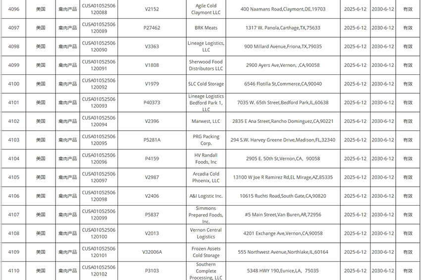 新增美國豬肉、禽肉企業(yè)自2025年6月12日及之后生產的符合中國要求的肉類產品輸華。其中83家禽肉企業(yè),23家豬肉企業(yè)。