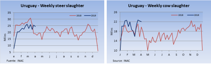 上漲的主要是面向國內(nèi)市場的待宰牛,小牛犢和小閹牛價格自年初以來漲了40%,最近由于價格回調(diào),總漲幅應(yīng)該在35%左右,年初預(yù)計出口活牛價格會上漲15%,但目前也已經(jīng)遠(yuǎn)遠(yuǎn)超過這個漲幅。雖然屠宰量還是很高,但從結(jié)構(gòu)來看屠宰增加的主要是母牛,二月屠宰量同比增加29%,而小牛犢和閹牛屠宰量減少了15%。面向本地市場的小牛犢和閹牛供應(yīng)短缺,主要因?yàn)轱曈龍隼麧櫬什蛔愣M(jìn)行存欄清盤,同時夏季良好的飼草情況也使活牛生產(chǎn)商可以等待合理的時機(jī)出售。