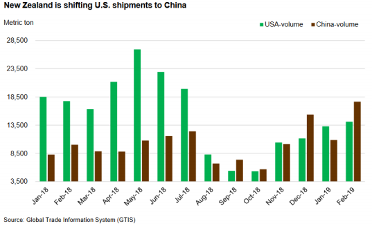 一月美國進口牛肉量同比增加2%,達到2.53億磅,除了新西蘭其他主要供應國都有增加,新西蘭進口量同比減少了36%,自2012年以來最低,主要因為產(chǎn)量減少,再加上出口亞洲的量增加。預計2019年美國牛肉進口量30.1億磅。