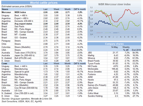 Marfrig的CEO稱,出口中國市場(chǎng)價(jià)格上漲,有助于支撐烏拉圭活牛價(jià)格,但工廠利潤空間還是不大。因?yàn)閮纱笠蛩鼗钆J袌?chǎng)很難達(dá)到平衡,第一育肥牛供應(yīng)量很少,第二冬天即將來臨,冬天供應(yīng)量正常會(huì)下降。中國非洲豬瘟的惡化催生了很多的投機(jī)者,但Marfrig的策略還是照顧長期客戶,即使這樣沒法賣出最高的價(jià)格。