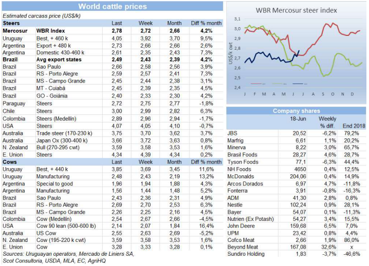 活牛價(jià)格堅(jiān)挺、貨幣穩(wěn)定推高了南方共同市場(chǎng)閹牛價(jià)格,本周增長(zhǎng)了6美分到2.78美金/公斤,達(dá)到2018年五月以來最高值。巴西重新可以出口中國(guó)之后,活牛價(jià)格上漲,把之前的跌幅全部漲回來了,主要出口州育肥閹牛價(jià)格漲了3雷亞爾/15公斤,達(dá)到140.5雷亞爾,換算成美金漲了6美分到2.49美金。烏拉圭牛價(jià)漲到4美金以上,自2011年以來第一次,阿根廷閹牛價(jià)格和上周一樣,但比索增值2.6%,美金牛價(jià)漲了7美分到2.73美金,只有巴拉圭牛價(jià)小幅下跌3美分到2.72美金。