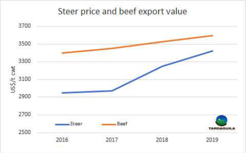 2017年國(guó)家肉類協(xié)會(huì)審查的16家工廠里有11家虧損,而現(xiàn)在的情況只會(huì)更糟,因?yàn)檎汲杀?span lang="EN-US">70-80%的活牛采購(gòu)價(jià)格上漲的比牛肉銷售價(jià)格高出太多,2017年閹牛采購(gòu)均價(jià)大約2970美金/噸,而平均出口價(jià)格為3452美金,差價(jià)約16%。2018年烏拉圭活牛市場(chǎng)由于更加缺牛,閹牛采購(gòu)價(jià)格漲到3250美金/噸,而出口均價(jià)漲幅不大,因此差價(jià)縮小到9%。2019年至今牛價(jià)大幅上漲,閹牛采購(gòu)均價(jià)漲到3420美金/噸,只比出口均價(jià)3593美金低不到5%。