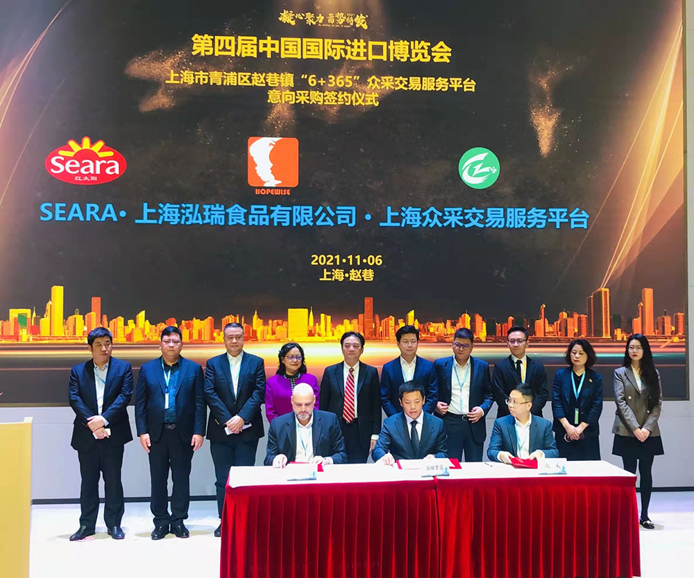 簽約儀式上,巴西集團(tuán)旗下的SEARA MEATS與北京泓睿&上海泓瑞食品有限公司和上海眾采企業(yè)發(fā)展有限公司簽約。