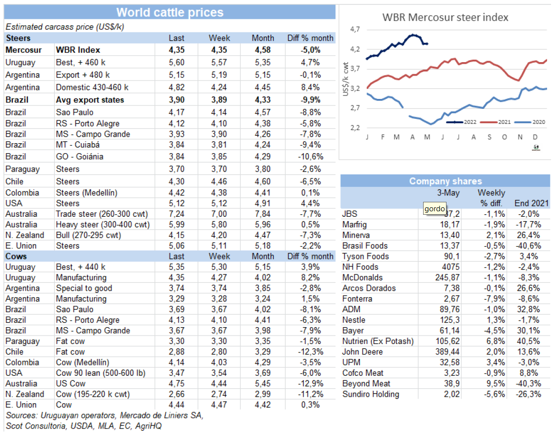巴西育肥牛價格連續(xù)七周下跌后,市場達到了新的平衡。最近一周價格僅下跌了1雷亞爾/15公斤,主要出口州育肥牛價格參考價291雷亞爾/15公斤。需求方面,在周末母親節(jié)的額外需求的加持下,圣保羅批發(fā)市場銷售情況不錯。草飼牛的供應增長,給市場帶來了一些壓力,預計五月前兩周市場將保持穩(wěn)定。