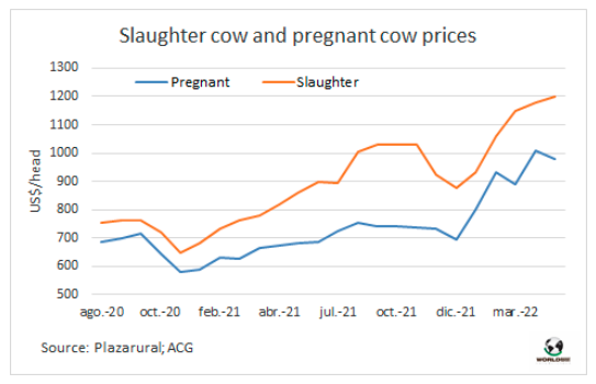 受歐盟價格下降和以色列市場空缺的原因,出口閹牛價格連續(xù)兩周保持穩(wěn)定。質(zhì)量最好的英國純種閹牛價格在540-550比索之間,澤布雜交品種的價格上漲到510-530比索/公斤,特優(yōu)母牛價格也保持不變,470-480比索/公斤。主要賣到中國市場的工業(yè)母牛最高價下降了10比索/公斤至400-430比索/公斤的范圍。