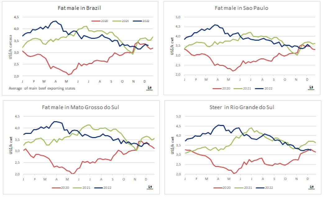 明年受中國(guó)需求減弱和供應(yīng)增加的影響,圣保羅育肥牛價(jià)格將低于今年的水平。預(yù)計(jì)在250-270雷亞爾/15公斤之間波動(dòng)。分析師稱,明年預(yù)計(jì)牛價(jià)持續(xù)堅(jiān)挺,隨后價(jià)格會(huì)下跌。“一些人認(rèn)為牛價(jià)在頂部會(huì)趨于平穩(wěn),但事實(shí)并非如此。牛周期處于下行階段,2019-2021年期間生產(chǎn)端為提高生產(chǎn)能力進(jìn)行了大量投資。明年年初牧草漲勢(shì)較好將幫助農(nóng)民賣個(gè)好價(jià)錢,但分析師認(rèn)為這種情況不會(huì)持續(xù)太久,屠宰端為了應(yīng)對(duì)這種情況已經(jīng)開(kāi)始減產(chǎn)。原本幫助抵消國(guó)內(nèi)市場(chǎng)消費(fèi)下降的出口業(yè)務(wù)明年也不會(huì)出現(xiàn)2022年的出色表現(xiàn),因?yàn)橹袊?guó)作為巴西牛肉的主要出口目的地對(duì)進(jìn)口牛肉的依賴逐步減小。
