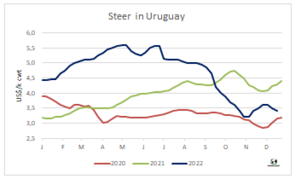 本周南方共同市場(chǎng)閹牛價(jià)格指數(shù)下跌了5美分,至3.35美元/公斤。巴西、巴拉圭、烏拉圭牛價(jià)走弱,阿根廷牛價(jià)保持穩(wěn)定。巴西主要出口州閹牛價(jià)格從上周的3.34美元/公斤下跌至3.29美元/公斤,且本周雷亞爾兌美元匯率調(diào)貶。