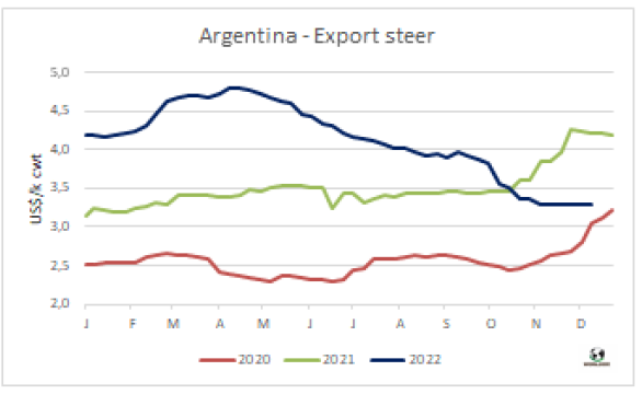 阿根廷出口閹牛價(jià)格連續(xù)四周反彈之后,結(jié)束了上漲趨勢(shì)。這最好的出口閹牛價(jià)格報(bào)價(jià)550-560比索/公斤,本地和澤布雜交牛530-540比索/公斤。特優(yōu)和良種母牛價(jià)格仍在490-500比索/公斤,主要賣到中國(guó)市場(chǎng)的工業(yè)母牛價(jià)格370-430比索/公斤。