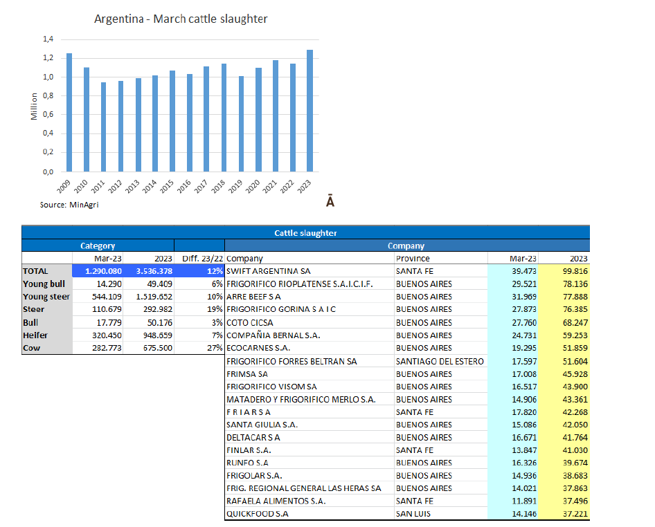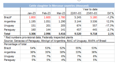 在年比較中,增幅最大的屠宰類別是母牛,尤其是年長(zhǎng)的母牛,增長(zhǎng)了27%,其次是閹公牛,增長(zhǎng)了19%。母牛占2023年3月屠宰總量的46%。如果考慮工作日平均屠宰量,則有下降:在這種情況下,3 月的屠宰量與上個(gè)月相同,同比增長(zhǎng) 7%。