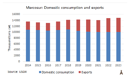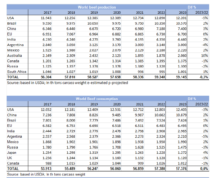 根據(jù)美國(guó)農(nóng)業(yè)部上周發(fā)布的預(yù)測(cè),主要的牛肉出口商會(huì)保持其對(duì)國(guó)際市場(chǎng)的穩(wěn)定銷售量,一些國(guó)家的銷售量減少將被其他國(guó)家的增長(zhǎng)銷量所抵消。三個(gè)主要出口國(guó)巴西、澳大利亞和印度將增加銷量,而其他國(guó)家(美國(guó)、阿根廷、烏拉圭、巴拉圭和新西蘭)將減少銷量,因此最終平均下來(lái)銷量與2022年非常相似。南方共同市場(chǎng)、大洋洲、北美和印度的總銷量約為1070萬(wàn)噸,比去年增加6.7萬(wàn)噸。
