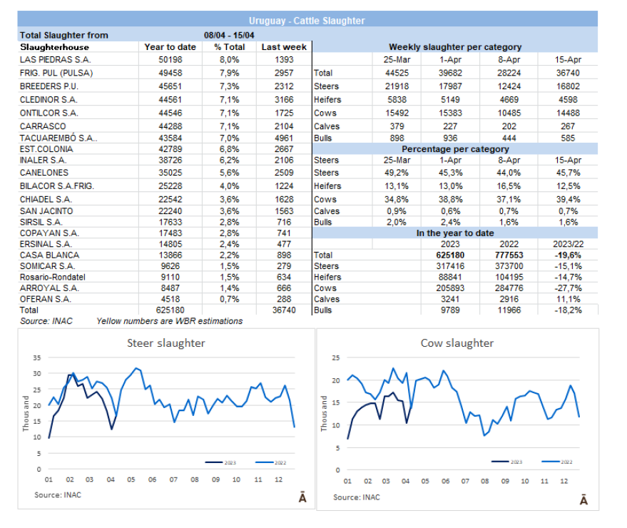 INAC報(bào)告說(shuō),有36740頭牛進(jìn)入工廠,其中16802頭是公牛(占總數(shù)的46%)和14488頭母牛(占總數(shù)的39%)。本周產(chǎn)量最高的工廠是Marfrig-Tacuarembó ,有4961頭牛在加工,遠(yuǎn)遠(yuǎn)超過(guò)Marfrig-Cledinor(3166頭)和Minerva-Pulsa(2957頭)。在這一周里,Marfrig屠宰了12900頭牛,Minerva屠宰了7570頭牛。4月上半月,屠宰了68019頭牛,比2022年同期減少了34%。