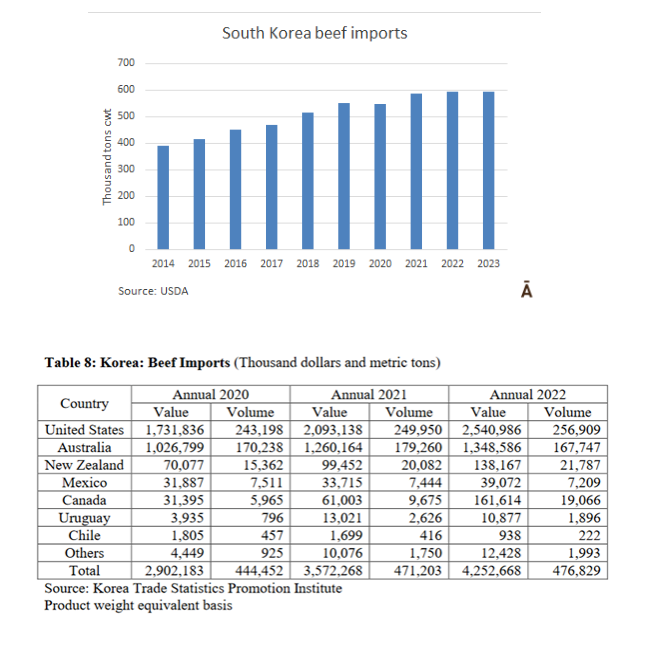 美國(guó)農(nóng)業(yè)部預(yù)計(jì)韓國(guó)2023年的牛肉進(jìn)口量為59.5萬(wàn)噸,與2022年持平,比1月份的預(yù)測(cè)量低1.5萬(wàn)噸。國(guó)內(nèi)供應(yīng)將增加近40噸達(dá)到37.9萬(wàn)噸。