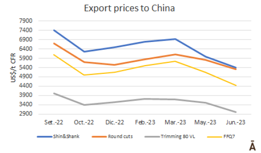 出口到中國的主要產品的參考價格比去年第四季度的最低價還要低5%-15%,相對而言帶骨產品價格則比較穩(wěn)定。