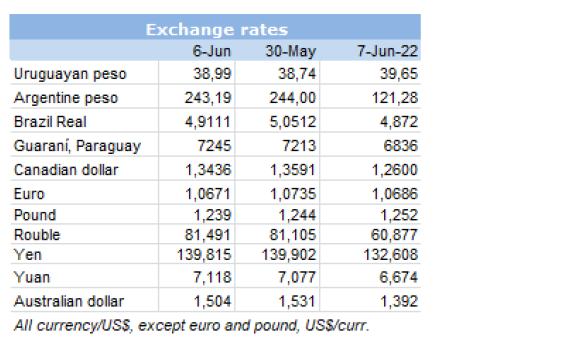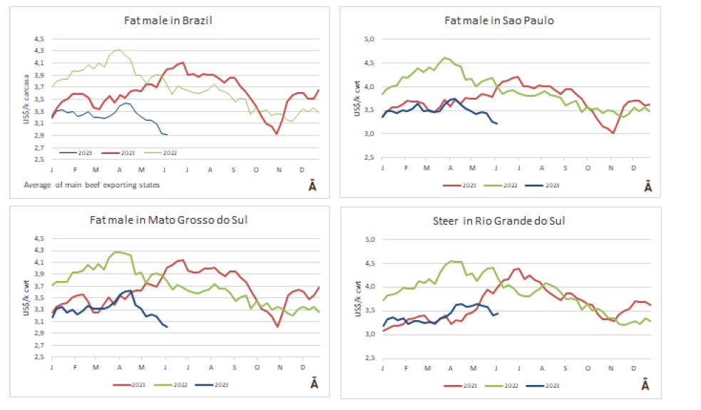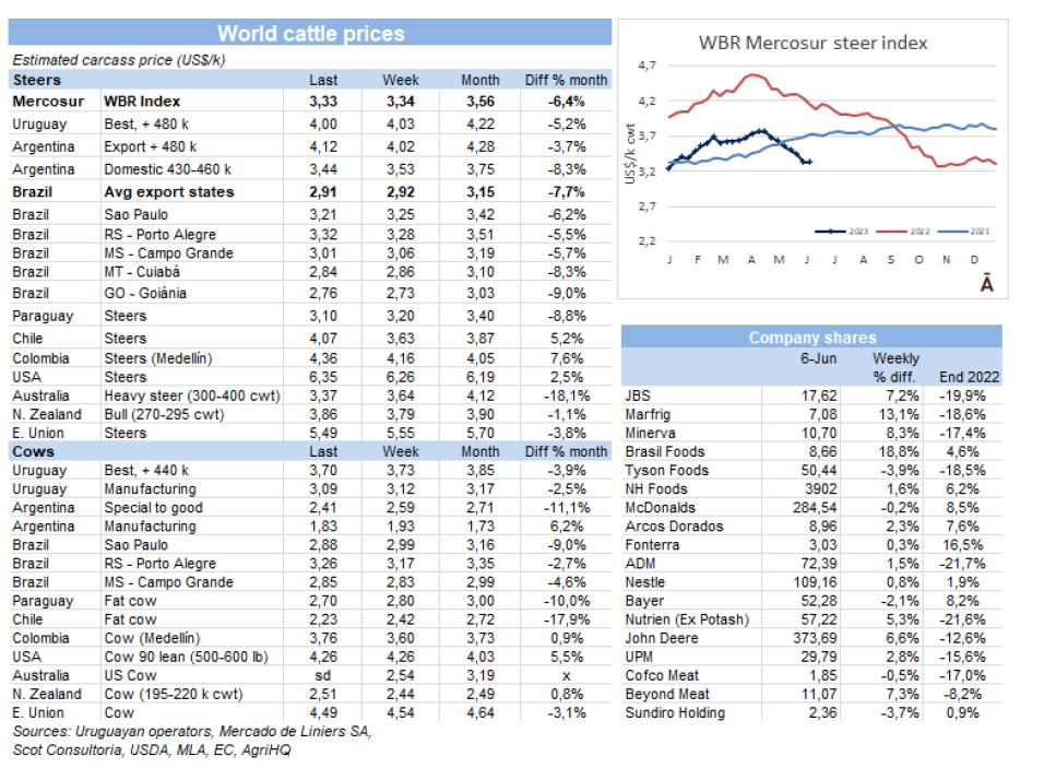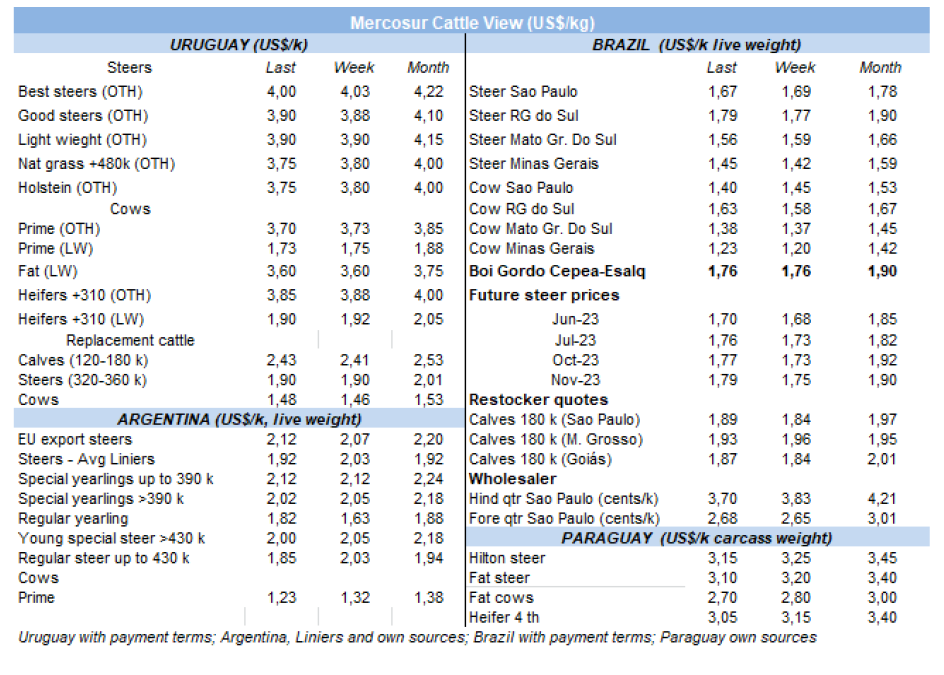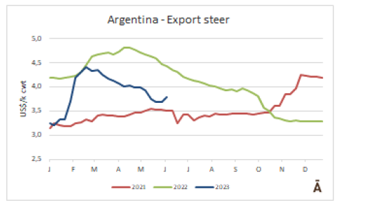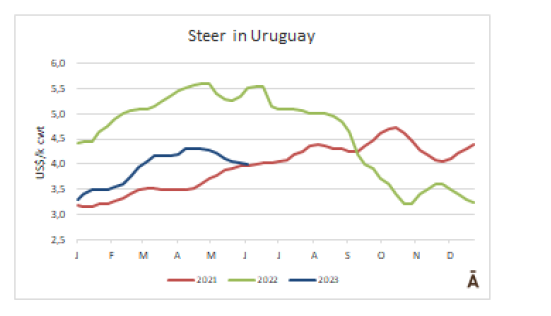 在烏拉圭和巴拉圭,價格趨勢是向下跌的,與低迷的國際環(huán)境一致。烏拉圭的閹公牛價格下降了3美分-4美元每公斤。