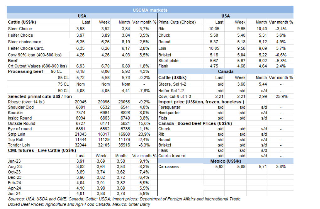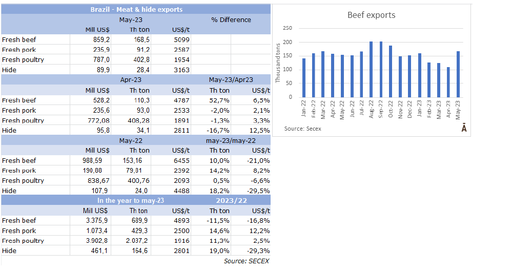 外貿部報告稱,5月巴西出口了168,510噸牛肉,出口額8.59億美元,均價為每噸$5099。由于往中國出口更加順暢,與4月份相比,數(shù)量增長了53%(超過5.8萬噸),均價回升了6.5%。是2022年10月以來最大出口量。