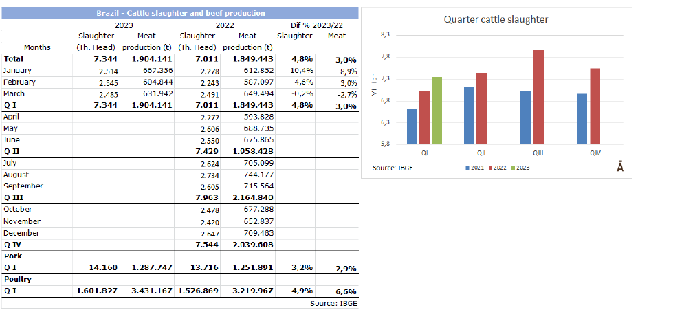 根據(jù)巴西地理和統(tǒng)計局昨天發(fā)布的詳細報告顯示,2023年第一季度中巴西屠宰牛總量為734萬頭,同比增加4.8%。由于胴體均重下降了4.5%,達到259.3公斤,牛肉產量較去年增加了3%達到185萬噸。