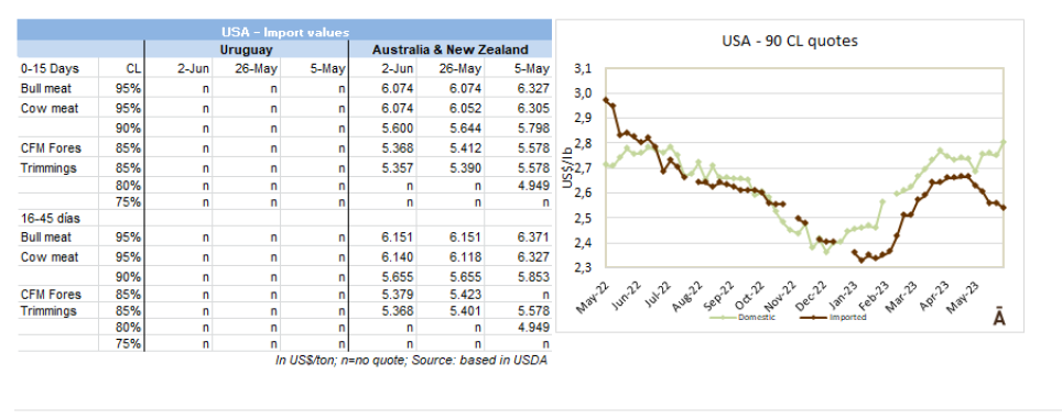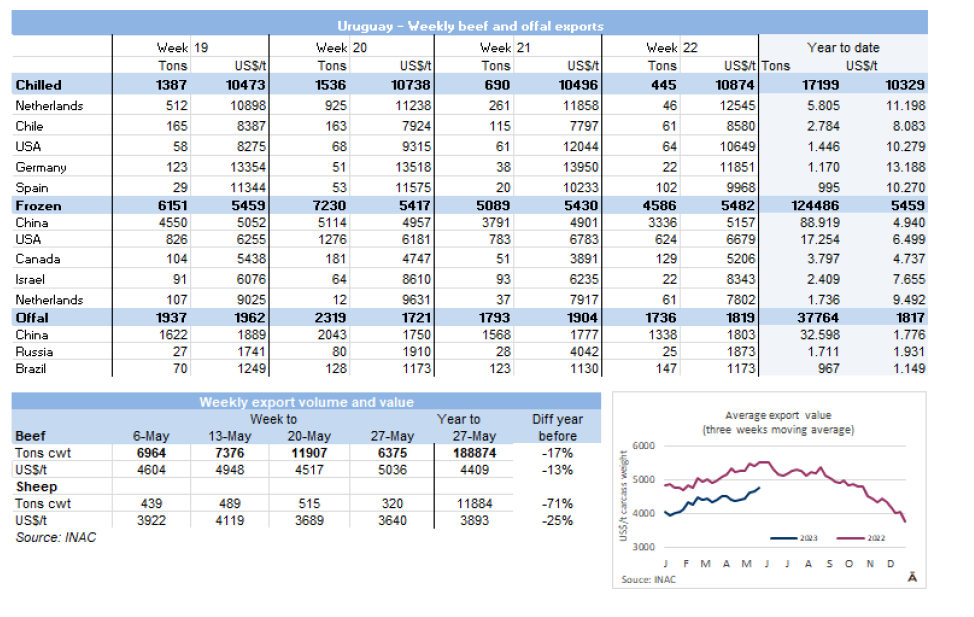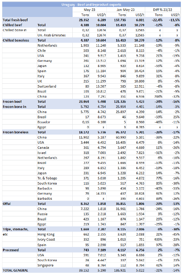根據(jù)海關數(shù)據(jù),2023年1-5月,烏拉圭牛肉累計出口達13.8萬噸,同比減少22%。均價同比降低了14%,至每噸$6001。