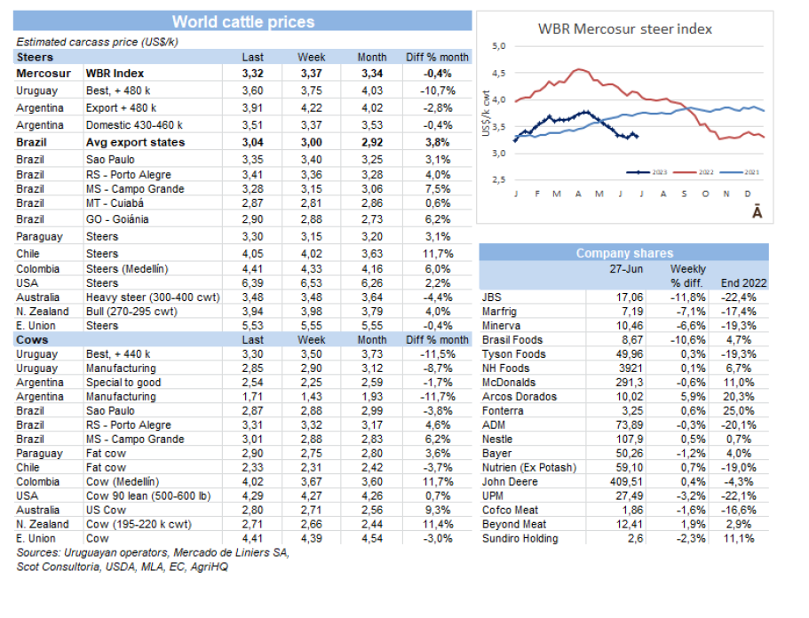 卡內(nèi)洛內(nèi)斯與科洛尼亞和伊納勒這兩個(gè)工廠一樣,是馬弗里格在該國(guó)南部(那里的干旱情況更嚴(yán)重)的不活動(dòng)工廠??坡迥醽喴呀?jīng)有五個(gè)星期沒有活動(dòng)了,仍然沒有恢復(fù)的日期;伊納勒上周加入了。原則上,這兩個(gè)Marfrig工廠將在7月下半月恢復(fù)活動(dòng)。