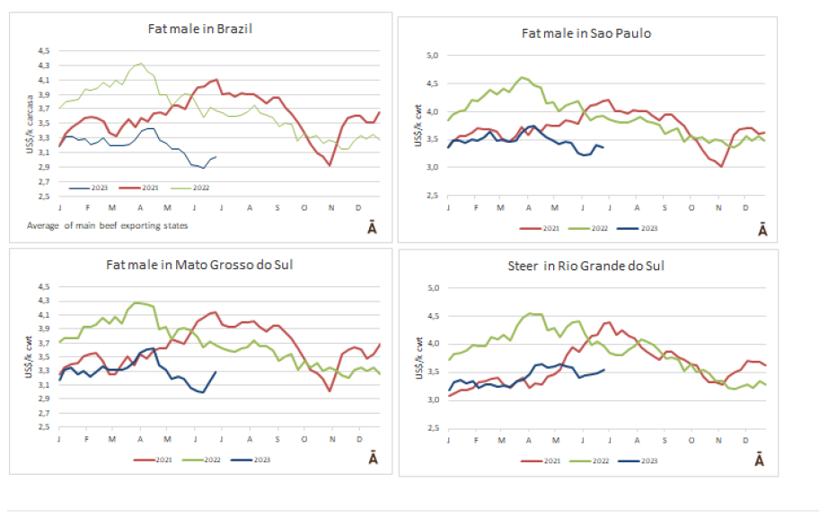 隨著阿根廷和烏拉圭的公牛價(jià)格下降,巴西和巴拉圭的公牛價(jià)格上升,該地區(qū)牛的屠宰價(jià)格差距縮小了。