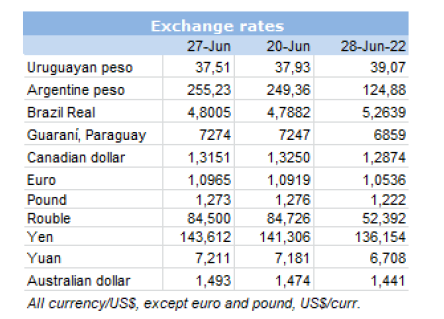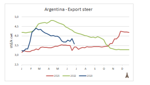 無(wú)論如何,阿根廷仍是該地區(qū)價(jià)格最高的國(guó)家,其次是烏拉圭,其價(jià)格趨勢(shì)也是向下的。本周的出口價(jià)格下降了15美分,為$3.60/公斤。