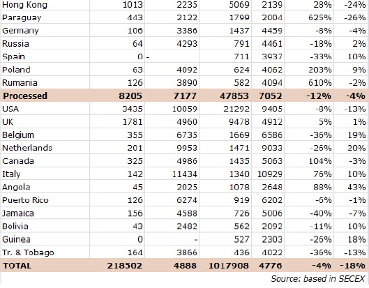 第二個(gè)主要目的地是智利,有近10000噸,其中近80%是冰鮮的的。緊隨其后的是菲律賓,出口量達(dá)到5278噸。