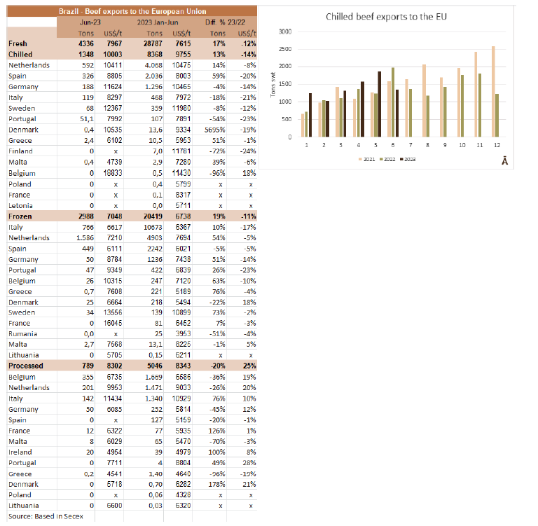 6月,巴西向歐洲聯(lián)盟(歐盟)國家出口了4336噸牛肉,其中2988噸為冷凍牛肉,1348噸為冰鮮牛肉。冷凍量每月收縮4%,而冰鮮收縮量為28%。