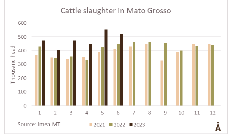 6月份,巴西主要牛肉供給州馬托格羅索的牛屠宰總量為51.98萬頭,略低于上月的55.2萬頭,但比2022年6月的44.6萬頭高出16.7%。根據(jù)伊米亞的說法,這是歷史系列中六月的最高記錄。