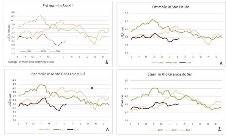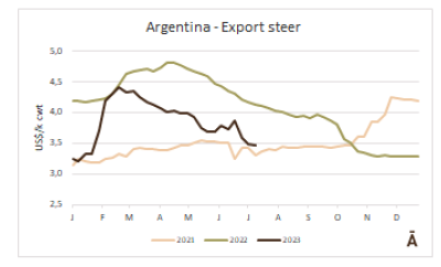 阿根廷和巴拉圭的情況正好相反。在阿根廷,公牛出口的價(jià)格并沒有抵消官方匯率的貶值,所以公牛的價(jià)格每公斤損失2美分,至每公斤3.79美元,其中包括9%的牛肉出口稅。