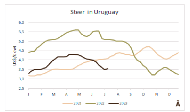 烏拉圭的價(jià)格也有所增加,特制公牛的價(jià)格以每公斤3.55美元出售,比前一周增加了5美分。