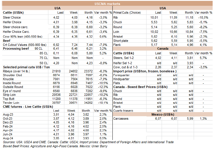 牛屠宰市場擺脫了5、6月期間普遍存在的劇烈下跌趨勢,上周一些特殊產(chǎn)品因?yàn)闆]有達(dá)到理想的價(jià)格而成交。