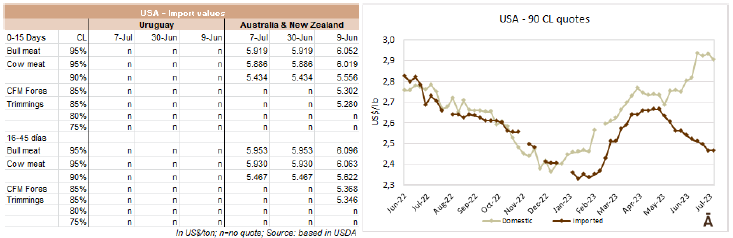 在這種情況下,烏拉圭向美國銷售的肉類價(jià)格基本穩(wěn)定,90Cl非配額參考價(jià)格保持在4000美元/噸CFR,95Cl保持在4250美元/噸