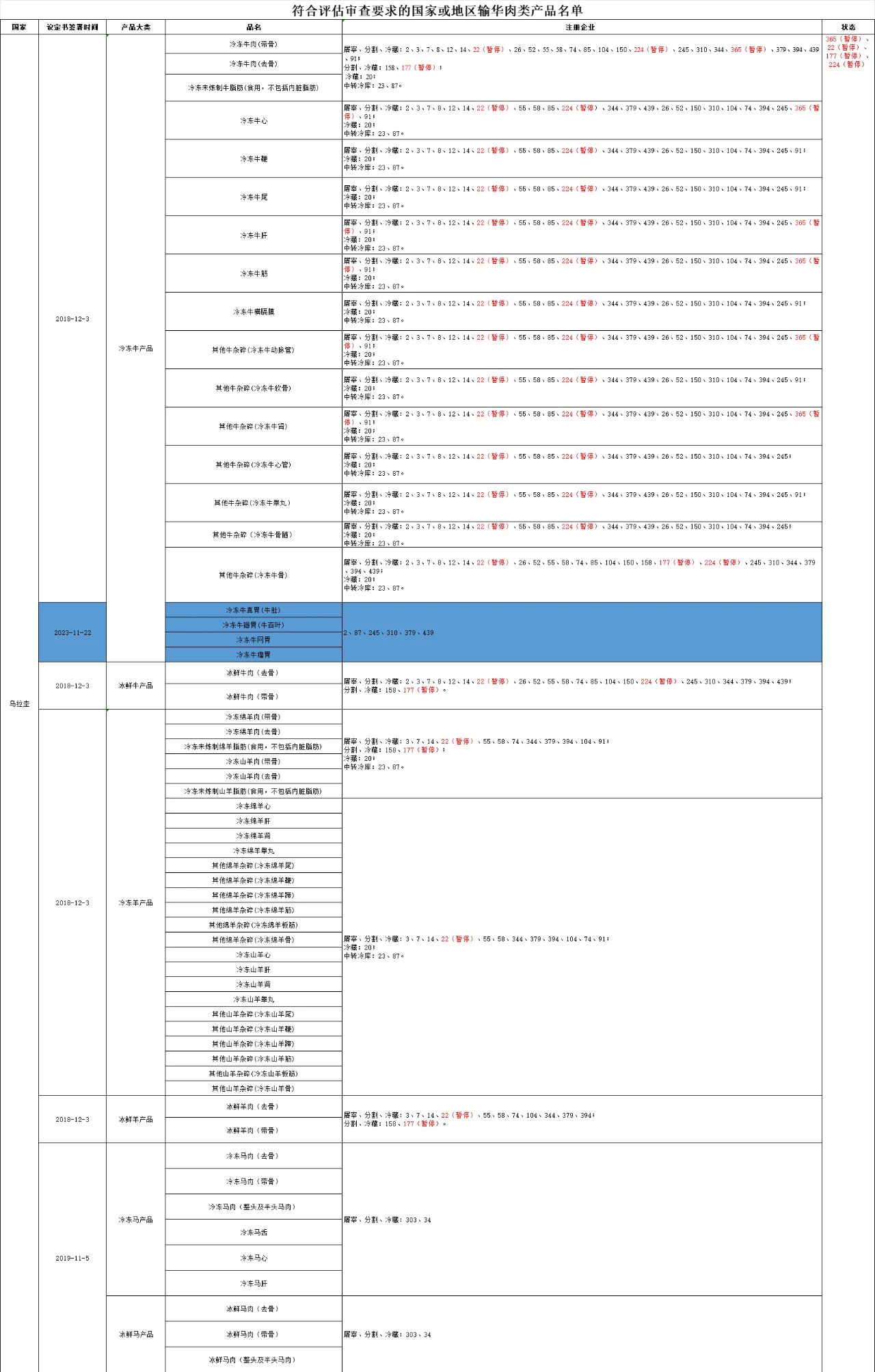 2024年5月9日,新增烏拉圭4家牛肉產(chǎn)品信息,分別是:冷凍牛真胃(牛肚)、冷凍牛瓣胃(牛百葉)、冷凍牛網(wǎng)胃、冷凍牛瘤胃;注冊(cè)工廠號(hào)為:2、87、245、310、379、439。