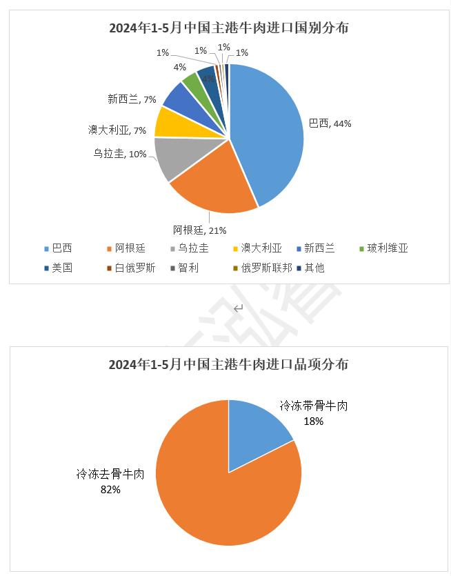 2024年1-5月中國主港牛肉進(jìn)口量共計119.82萬噸,同比增長23%。1-5月中國主港牛肉進(jìn)口金額共計55.51億美元,同比增長10%。
