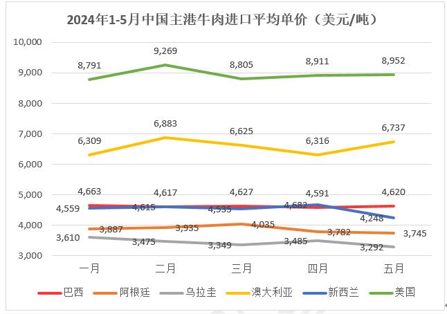 從進(jìn)口單價看,巴西1-5月平均單價為4627美元/噸,去年同期為5232美元/噸,阿根廷1-5月平均單價為3879美元/噸,去年同期為4215美元/噸,烏拉圭1-5月平均單價為3460美元/噸,去年同期為4120美元/噸,美國1-5月平均單價為8927美元/噸,去年同期為8421元/噸。各國進(jìn)口平均單價為4633美元/噸,去年同期為5188美元/噸??傮w來看,牛肉進(jìn)口單價同比均呈下降趨勢。