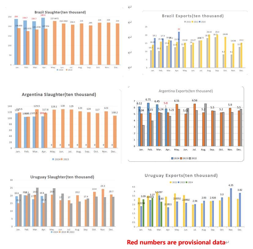 In Argentina, the prices drop 2 cents to US$3.93 per kilo due to the exchange variations, inclusive of a 9% beef export tax. As references handled by original exporter, the price of trimmings 80VL is between US$/t 2,400-$2,600, knuckle and flat at US$/t 5,150 and the cow in six cuts up to US$/t 4,200. The shin&shank is operated at US$/t 4,700-5,000 and the forequarter between US$/t 3,900-4,100, CFR in all cases. In April, the provisional data of Brazil beef export volume is 58 thousand tons and the numbers of cattle slaughter may catch 1.062 million heads.